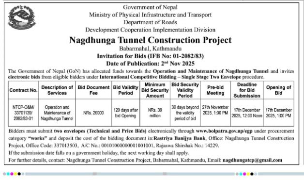 काठमाडाैं, १६ कार्तिक । नागढुङ्गा—सिस्नेखोला सुरुङ मार्ग अब अन्तर्राष्ट्रिय अनुभवी सेवा प्रदायकमार्फत सञ्चालन र मर्मत गरिने भएको छ। नागढुङ्गा सुरुङ निर्माण आयोजनाले आइतबार अन्तर्राष्ट्रिय प्रतिस्पर्धात्मक बोलपत्र (टेण्डर) आह्वान गर्दै पाँच वर्षका लागि सेवा प्रदायक छनोटको प्रक्रिया अघि बढाएको हो। इच्छुक कम्पनीहरूले आगामी पुस २ गतेसम्म बोलपत्र बुझाउन सक्नेछन्।
