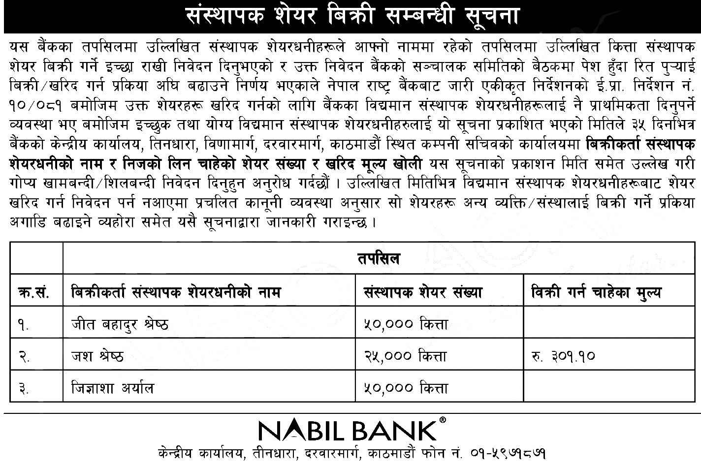 काठमाडाैं, २ मंसिर । नबिल बैंकले आफ्ना तीन जना संस्थापक शेयरधनीको स्वामित्वमा रहेका कुल १ लाख २५ हजार कित्ता संस्थापक शेयर बिक्रीमा राखेको छ। बैंकले नियमानुसार संस्थापक समूहभित्रै शेयर हस्तान्तरणका लागि प्राथमिक चरण सुरू गरेको जनाएको छ।