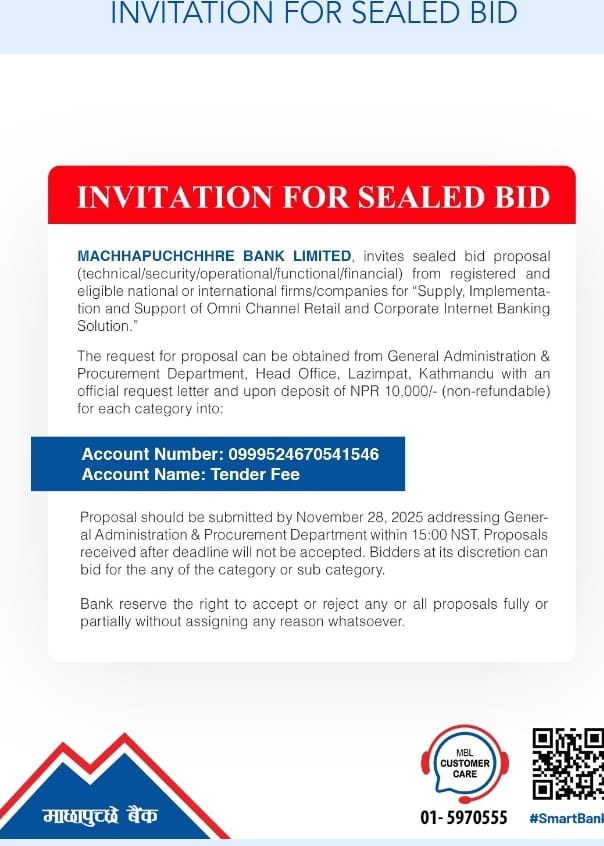 काठमाडाैं, ३ मंसिर । माछापुच्छ्रे बैंक लिमिटेडले आफ्ना सेवाहरू अझ आधुनिक र ग्राहक-मैत्री बनाउने उद्देश्यले ‘ओम्नी च्यानल रिटेल तथा कर्पोरेट इन्टरनेट बैंकिङ समाधान’का लागि सिलबन्दी बोलपत्र आह्वान गरेको छ।