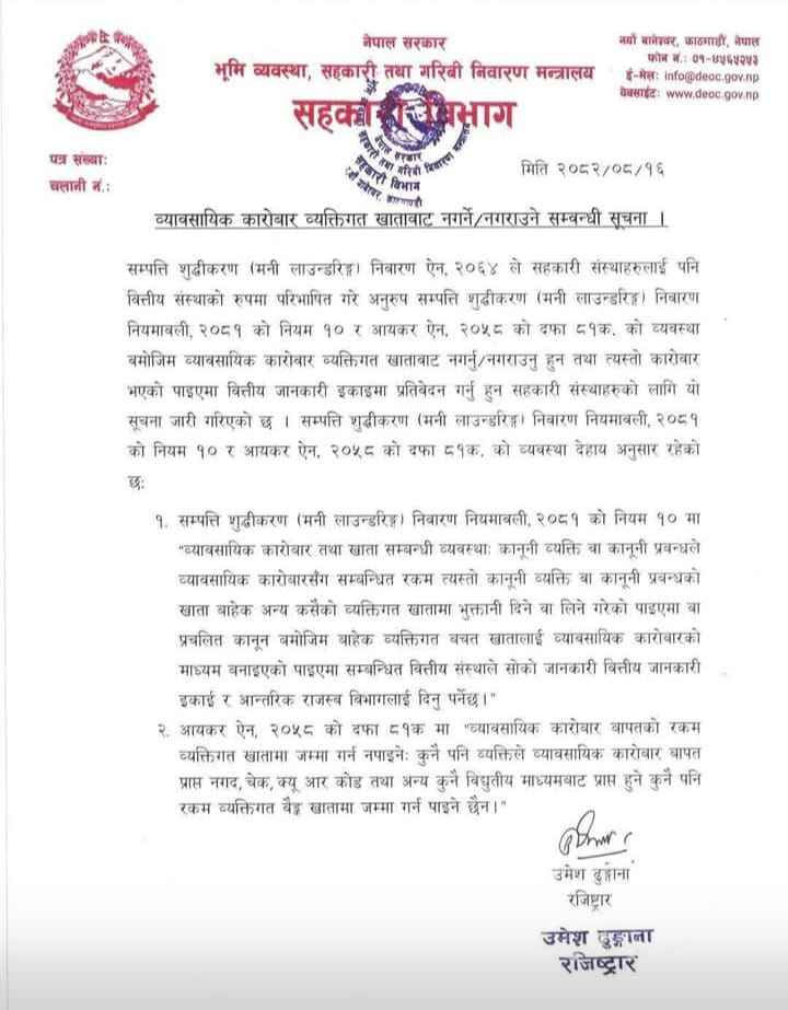 सहकारी विभागबाट बुधबार जारी सूचना अनुसार सम्पति शुद्धिकरण (मनी लाउन्डरिङ्ग) निवारण नियमावली २०८१ को नियम १० बमोजिम व्यवसायिकक कारोवार तथा खाता सम्बन्धमा कानूनी व्यक्ति वा कानूनी प्रवन्ध व्यवसायिक कारोवारसँग सम्बन्धित रकम त्यस्तो कानूनी व्यक्ति वा कानूनी प्रवन्धको खाता बाहेक अन्य कसैको व्यक्तिगत खातामा भुक्तानी दिने वा लिने गरेको पाइएमा वा प्रचलित कानून बमोजिम बाहेक व्यक्तिगत बचत खातालाई व्यवसायिक कारोवारको माध्यम बनाइएको पाइएमा सम्बन्धित वित्तिय संस्थाले सोको जानकारी इकाई र आन्तरिक राजस्व विभागलाई दिनुपर्ने उल्लेख छ ।