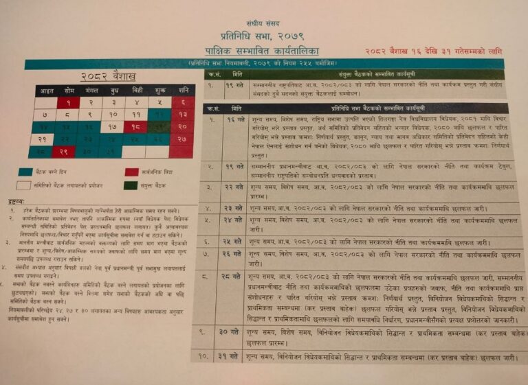 प्रतिनिधिसभा बैठक क्यालेन्डर सार्वजनिक, ‘प्रि बजेट’ छलफल वैशाख २८ देखि हुने (क्यालेण्डरसहित)