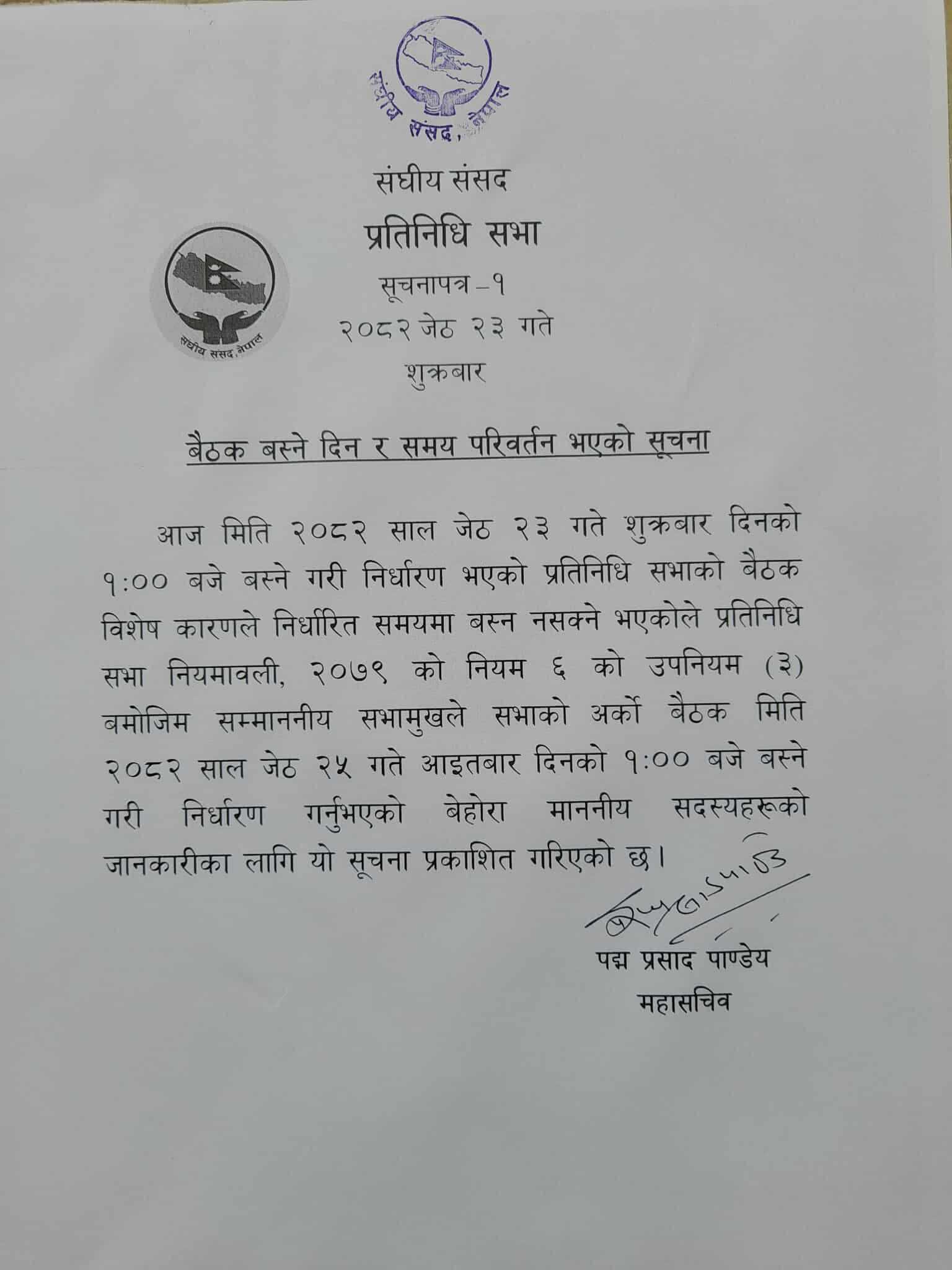 सभामुख देव राज घिमिरेको सचिवालयका अनुसार बैठक कुनै कारणवश सुरु हुन नसकी स्थगित गरिएको हो। सचिवालयले जानकारी दिँदै अब प्रतिनिधि सभाको अर्को बैठक आइतबार (जेठ २६ गते) दिउँसो १ बजे बस्ने जनाएको छ।