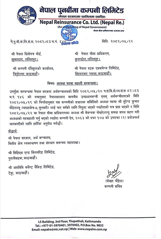 काठमाडाैं, २३ भदाै । नेपाल पुनर्बीमा कम्पनी लिमिटेडको अध्यक्षमा सुरेन्द्र कुमार पौडेल नियुक्त भएका छन्।
