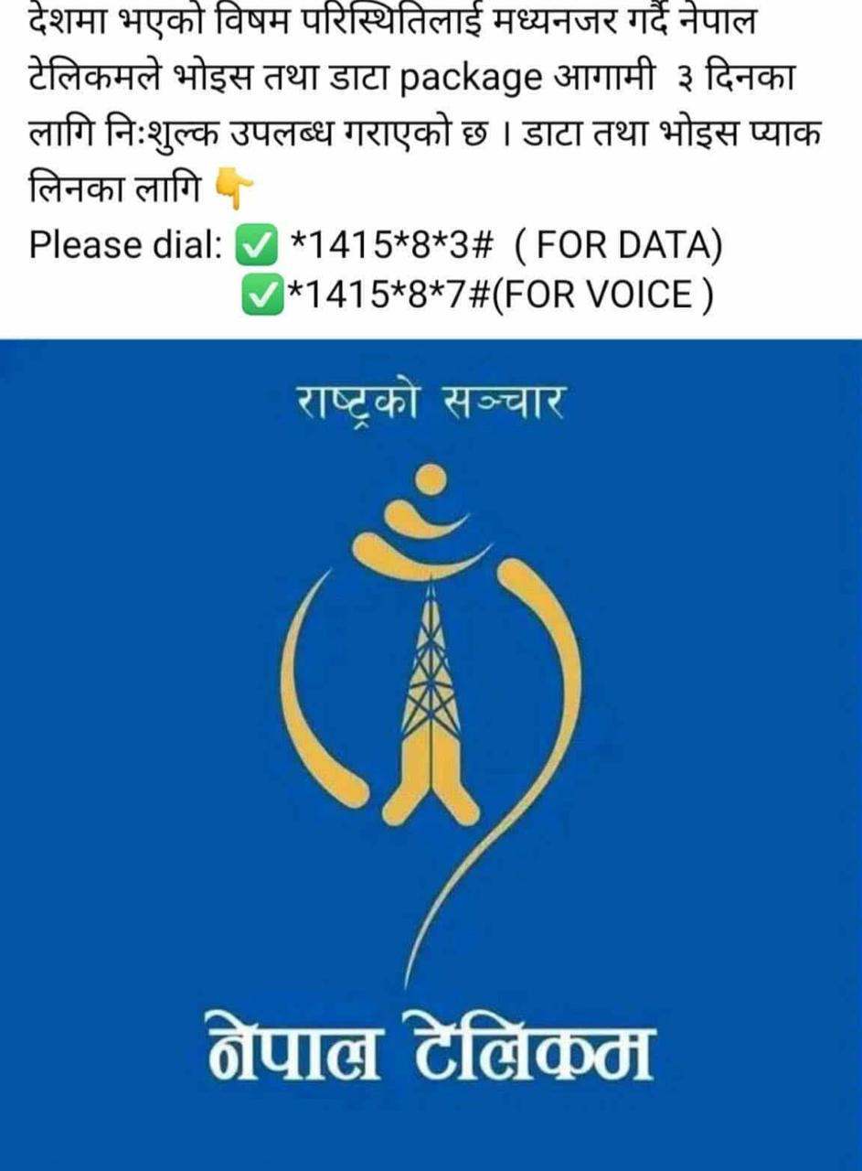 काठमाडाैं, २५ भदाै । हाल देशभर देखिएको विषम परिस्थितिलाई ध्यानमा राख्दै नेपाल टेलिकमले तीन दिनका लागि निःशुल्क डेटा र भ्वाइस सेवा प्रदान गर्ने निर्णय गरेको छ।