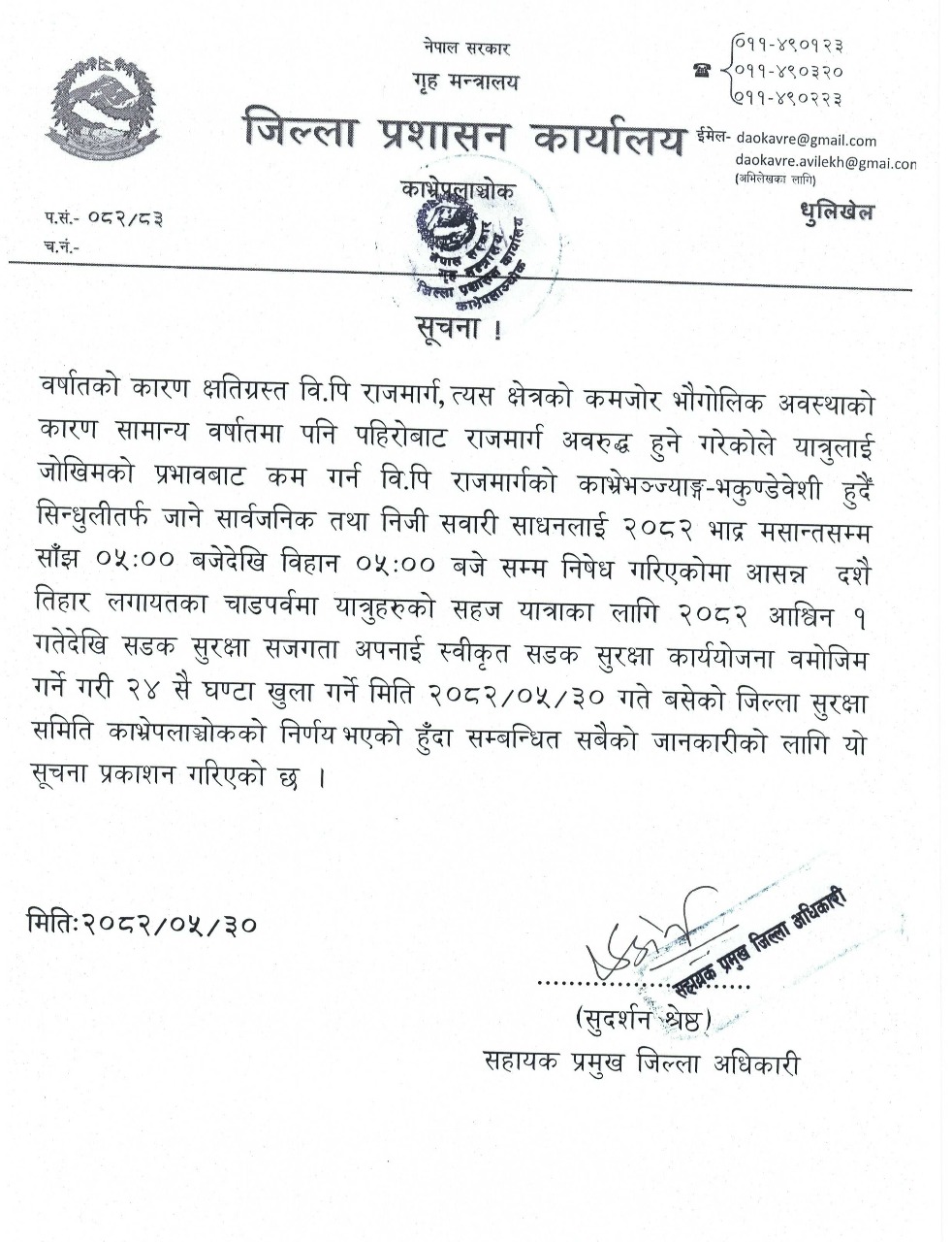 जिल्ला प्रशासन कार्यालय काभ्रेपलाञ्चोकले जारी गरेको सूचनामा भनिएको छ, ‘आसन्न चाडपर्वमा यात्रुको सहज यात्राका लागि सडक २४ घण्टा सञ्चालन गरिने भएको हुँदा सम्बन्धित सबैले सडक सुरक्षा मापदण्ड पालना गर्नुपर्नेछ।’