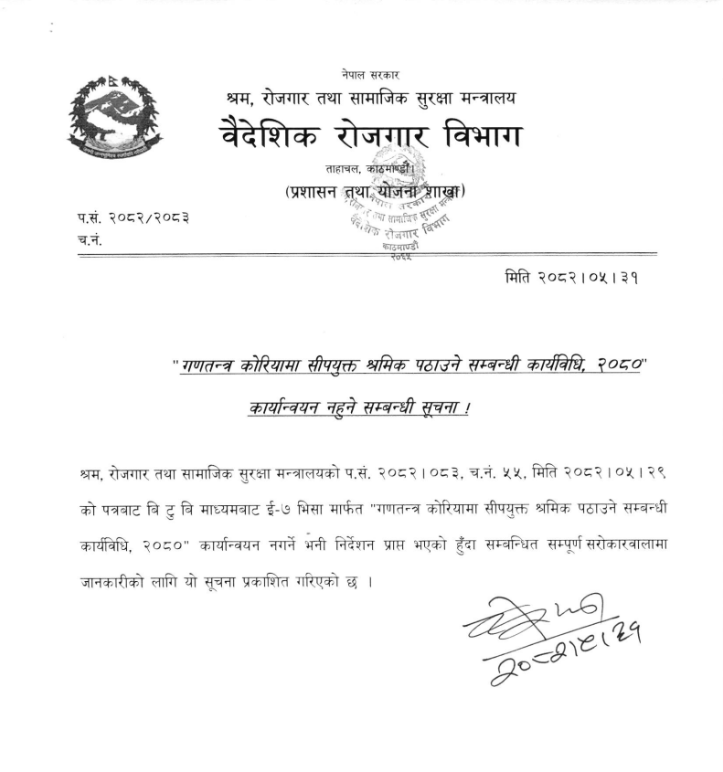 काठमाडाैं, १ असाेज । अब नेपाली कामदारले ई–७ भिसामार्फत कोरिया जान नपाउने भएका छन्। वैदेशिक रोजगार विभागले मंगलबार सूचना जारी गर्दै कोरियामा सीपयुक्त श्रमिक पठाउने कार्यविधि, २०८० कार्यान्वयन नगर्न श्रम, रोजगार तथा सामाजिक सुरक्षा मन्त्रालयको निर्देशन आएको जनाएको हो।