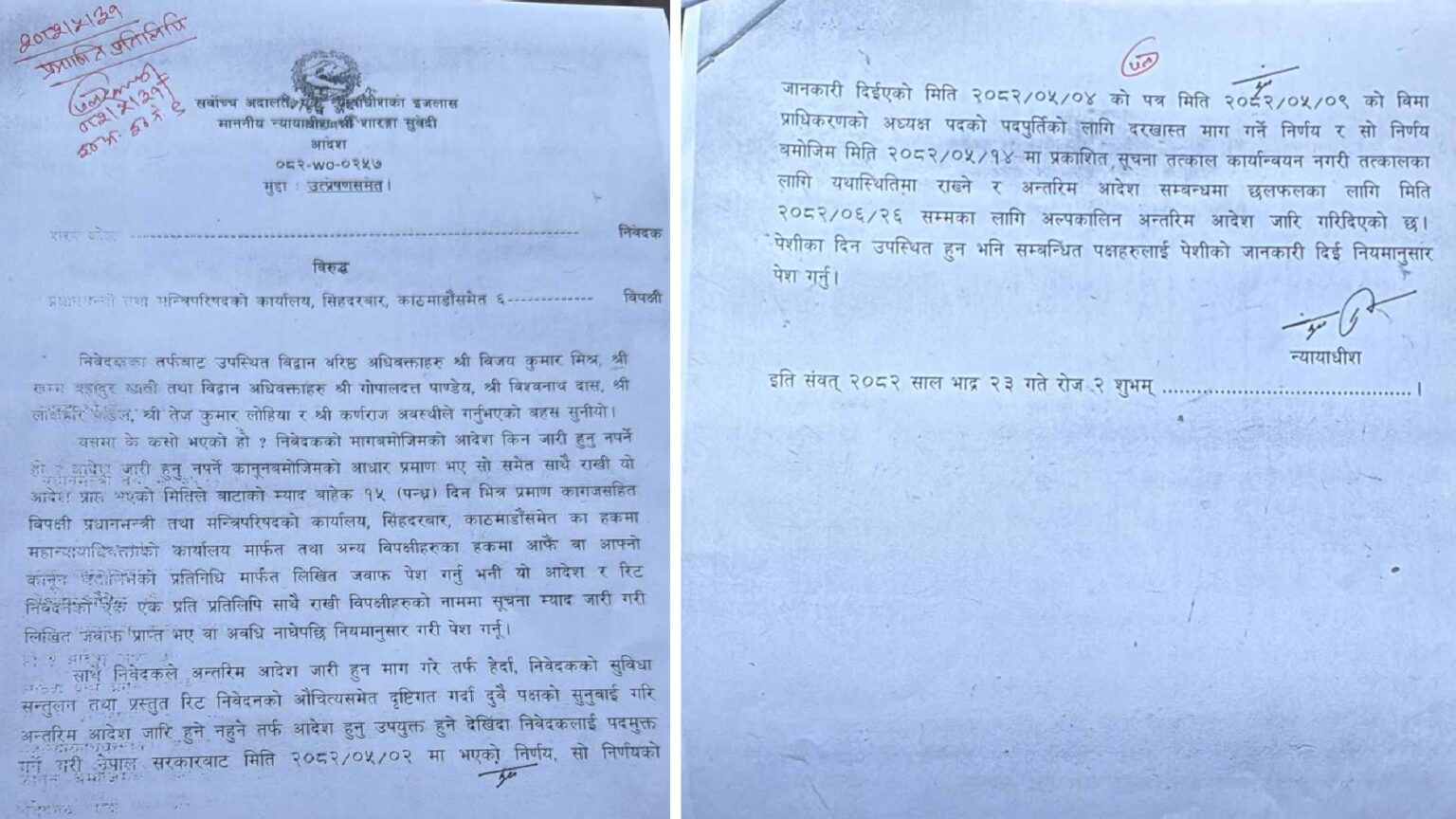 यस मुद्दामा विस्तृत छलफलका लागि अदालतले असोज २६ गते प्रधानमन्त्री कार्यालयसहित विपक्षी पक्षलाई उपस्थित हुन आदेश दिएको छ। विपक्षीहरूले आदेश नदिनुपर्ने कारण र प्रमाण सहित लिखित जवाफ पेश गर्नुपर्नेछ।