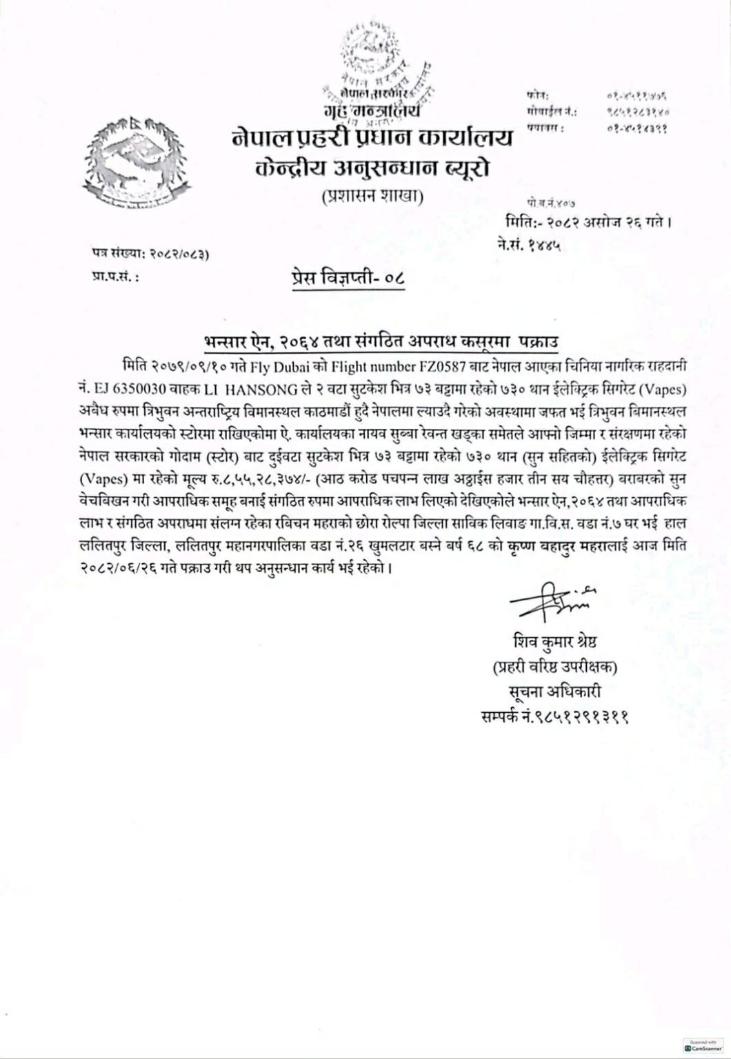 २०७९ पुस १० गते गते Fly Dubai को Flight number FZ0587 बाट नेपाल आएका चिनियाँ नागरिक राहदानी LI HANSONG ले २ वटा सुटकेशभित्र ७३ बट्टामा रहेको ७३० थान भेप त्रिभुवन विमानस्थल हुँदै भित्र्याएको विषयमा अनुसन्धान हुँदै जाँदा महरा तानिएका हुन् ।