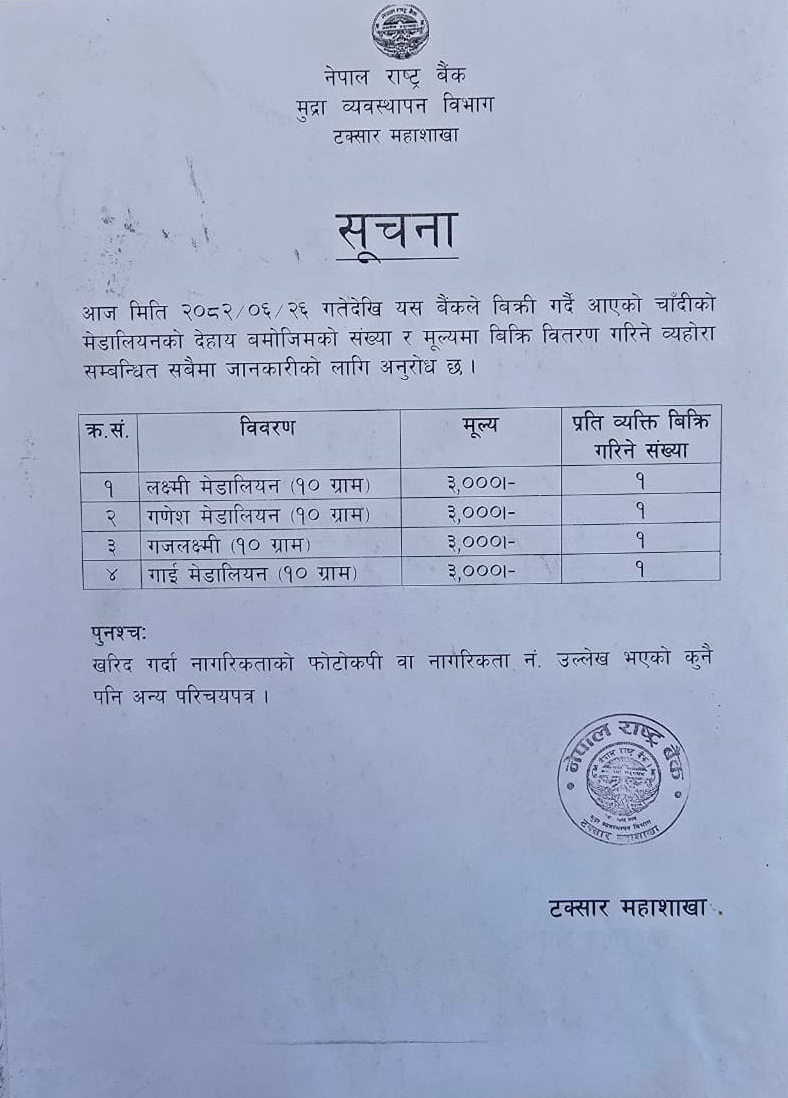 टक्सार महाशाखाले जारी गरेको सूचनाअनुसार, असोज २६ गतेदेखि लक्ष्मी, गणेश, गजलक्ष्मी र गाईको आकृतियुक्त चाँदीका मेडालियन बिक्रीमा आउनेछन् । प्रत्येक मेडालियनको तौल १० ग्राम र मूल्य ३,००० रुपैयाँ तोकिएको छ ।