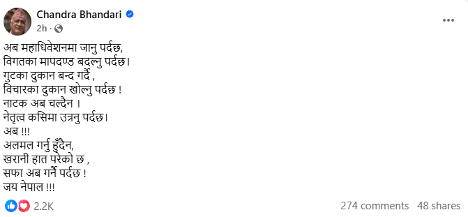 उनले अब पार्टीभित्र नाटक र अलमल गर्ने समय नभएको पनि बताए । उनले भनेका छन्,‘विगतका मापदण्ड बदल्नु पर्दछ । गुटका दुकान बन्द गर्दै विचारका दुकान खोल्नु पर्दछ ।नाटक अब चल्दैन ।नेतृत्व कसिमा उत्रनु पर्दछ। अब अलमल गर्नु हुँदैन । खरानी हात परेको छ । सफा अब गर्नै पर्दछ ।’