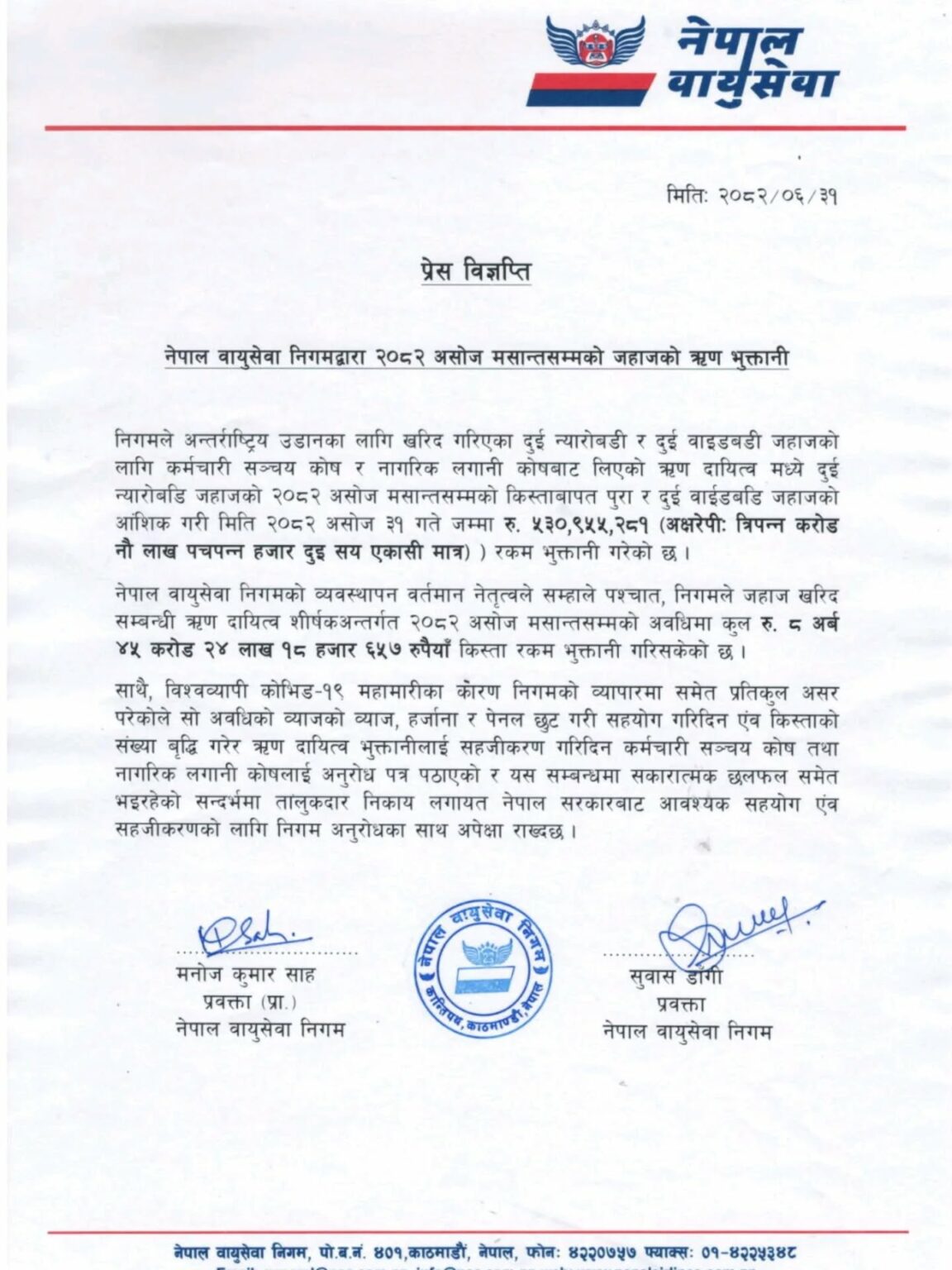 काठमाडाैं, २ कार्तिक । नेपाल वायुसेवा निगमले न्यारोबडी र वाइडबडी जहाज खरिदका लागि लिएको ऋणको असोज मसान्तसम्म ५३ करोड ९ लाख रुपैयाँ बराबरको किस्ता भुक्तानी गरेको छ।